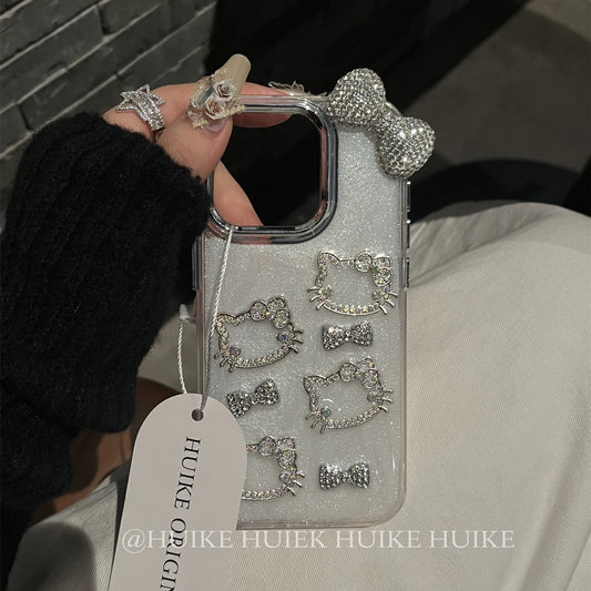 HANDMADE SILVERY KITTY CAT Sparkling Phone Case with Phone Charm Strap, Compatible for Samsung & iPhone