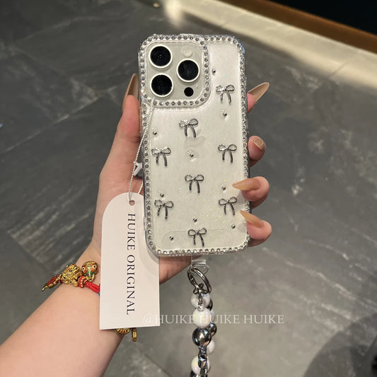 HANDMADE SLIVER BOW Transparent Drop Glue phone case with Phone Charm Strap