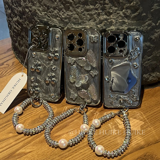 HANDMADE SLIVER BUTTERFLY Drip Glue Fine Glitter Phone Case with Phone Charm Strap