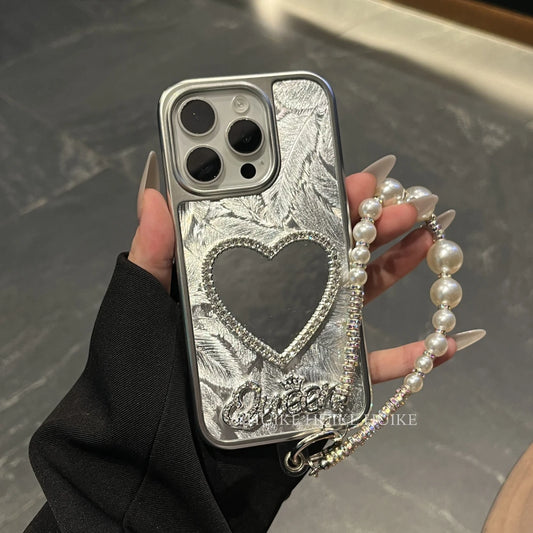 PEARL HEART Slivery Laser phone case with Phone Charm Strap