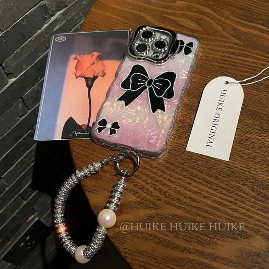 BLACK BOW Pink Shell Pattern phone case with Phone Charm Strap