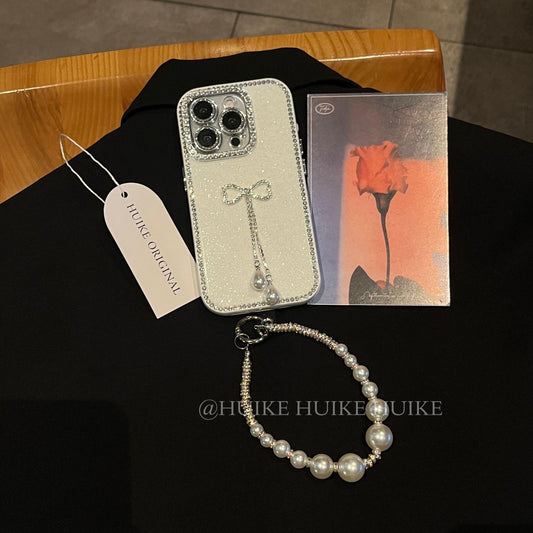 BOW TASSEL Rhinestone Border White Phone Case with Phone Charm Strap