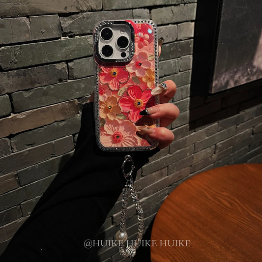OIL PAINTING FLOWERS Rhinestone Border Phone Case with Phone Charm Strap