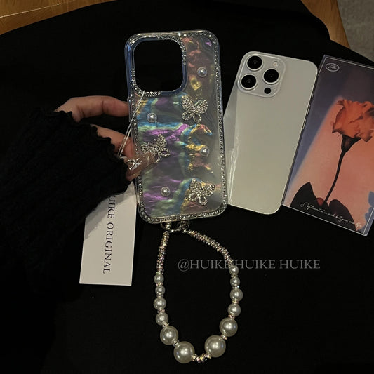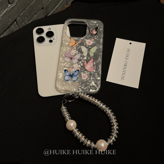 COLORFUL BUTTERFLY Pearls Transparent Phone Case with Phone Charm Strap
