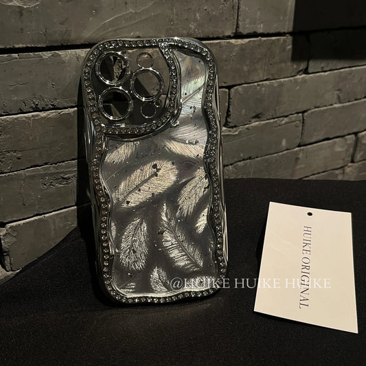 SLIVER FEATHER Sparkling Diamond Phone Case with Phone Charm Strap