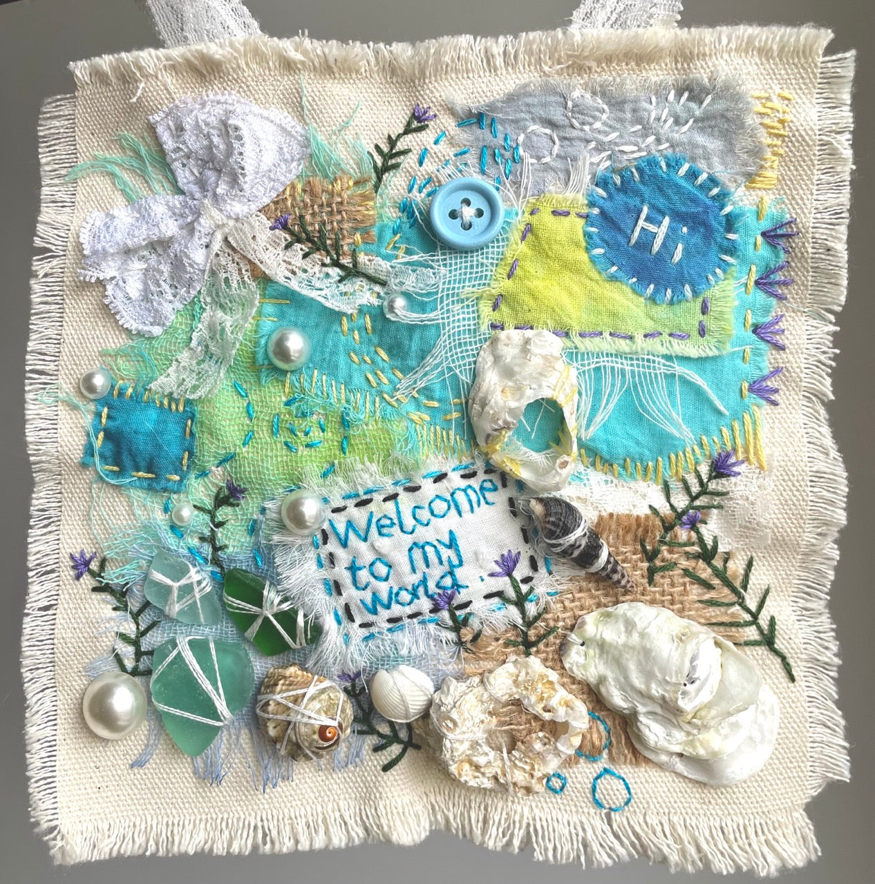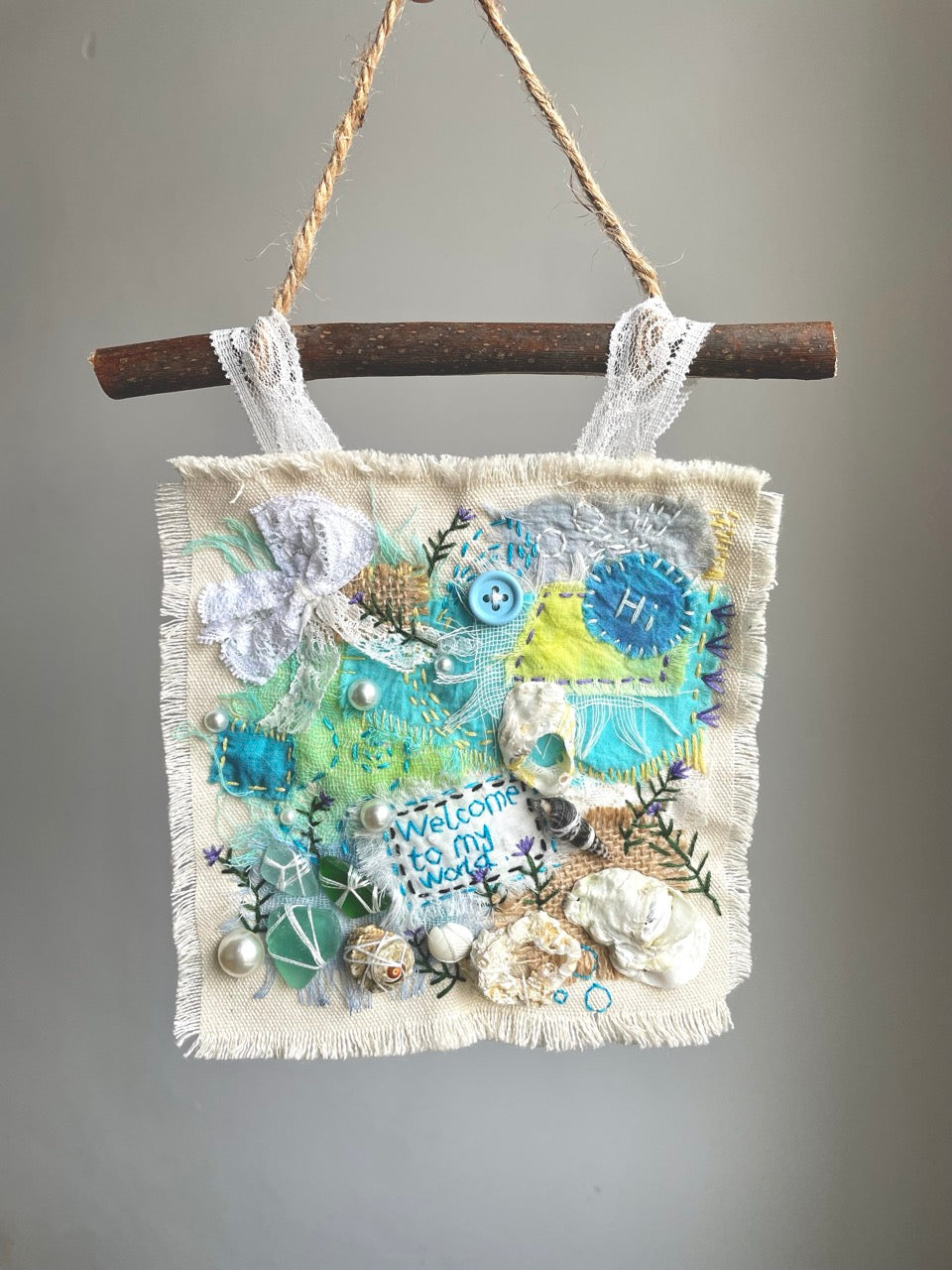 Shells, pearls, plant dyed fabrics, various fibers. Compose this blue ocean hanging painting. Discover the tranquil elegance of ocean-themed artwork, drifting gently in your space. 🐚